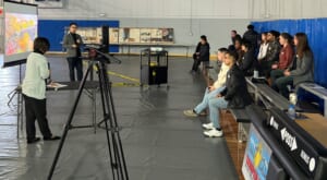 10月8日は、管理班の職員による説明を錦帯橋で行う予定でしたが、残念ながら雨のため、体育館での授業となりました。授業では、自然災害に遭いながらも、岩国市民の努力のもと、受け継がれてきた錦帯橋の歴史や構造について学んでいただきました。