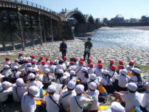 9月11日に平田小学校4年生、10月2日に柱野小学校5・6年生、10月9日に藤河小学校6年生に対して、錦帯橋のデザイン、構造、歴史について三択クイズを交えながら学んでいただきました。
