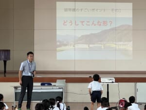 管理班職員による授業では、「錦帯橋のひみつ」をテーマに、9月4日に御庄小学校6年生、